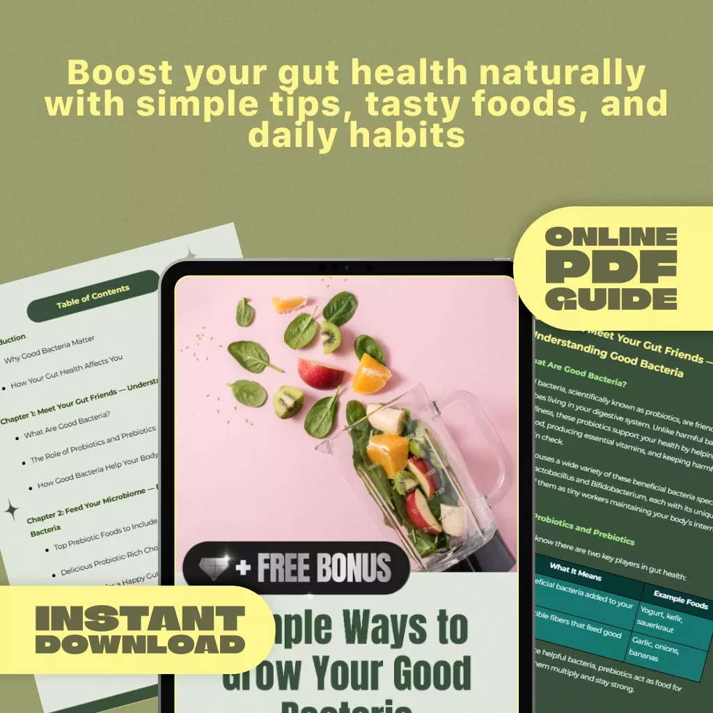 Do you wonder, “How can I increase good bacteria in my gut?” You’re not alone. Your gut is the gateway to your overall health, and this beautifully designed, easy-to-follow digital guide—Simple Ways to Grow Your Good Bacteria—will walk you step-by-step through the answers. Whether you’re just getting started with gut health or want a reliable, natural way to support your digestion and immune system, this eBook has everything you need to make real, lasting changes.