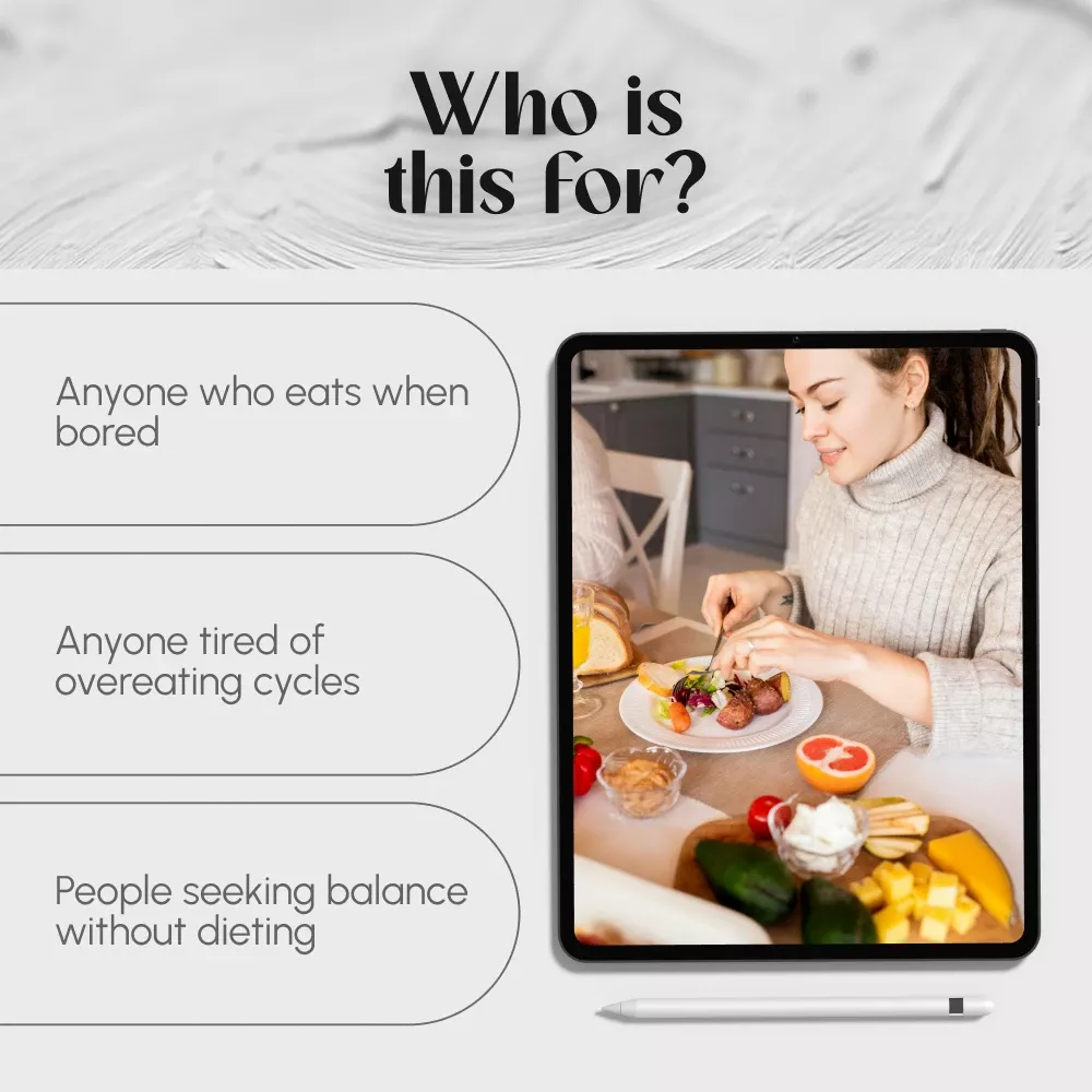 Anyone who wants to stop overeating, feel better in their body, and develop mindful, sustainable eating habits without following strict diets or starving themselves.