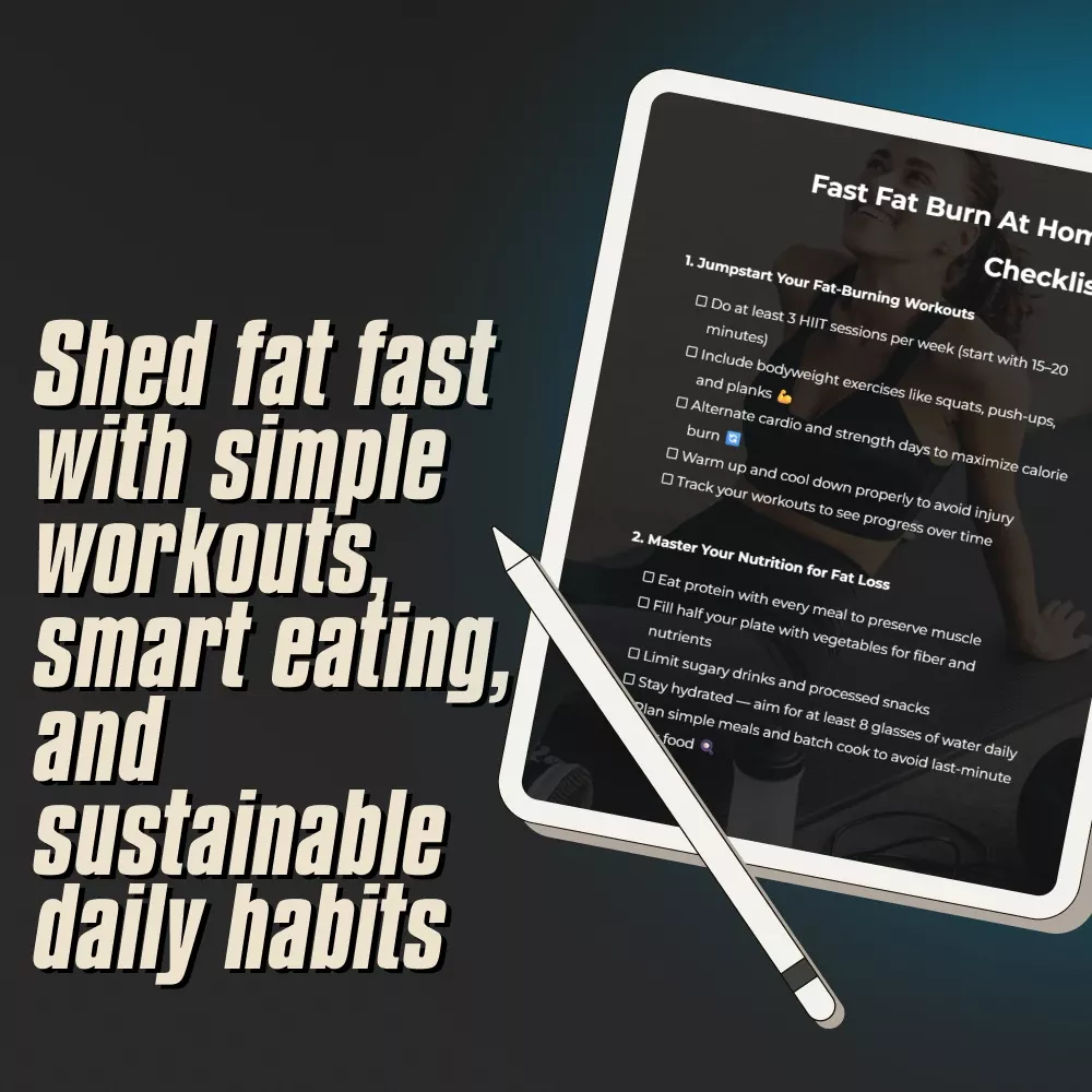 Start transforming your body and mindset from the comfort of your own space. Download the Fast Fat Burn At Home Checklist now and make every day a step toward your healthiest self. Your journey to faster fat loss begins here!