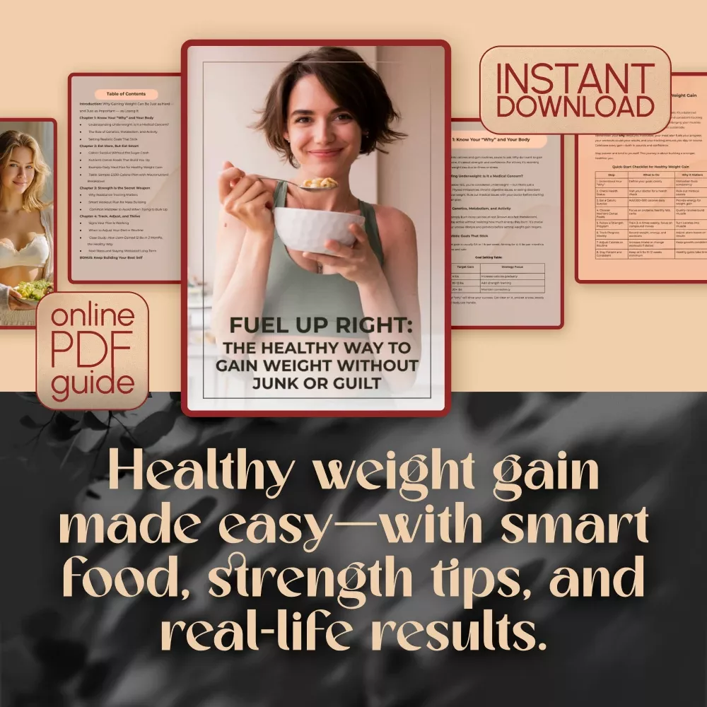 Struggling to put on healthy weight? You’re not alone—and you’re definitely not doomed to live on junk food just to see the scale move. Fuel Up Right: The Healthy Way to Gain Weight Without Junk or Guilt is a thoughtfully crafted digital guide designed to help you build mass the smart and nourishing way. Whether you’re recovering from illness, naturally thin, or just tired of crash diets and misleading bulk-up advice, this guide shows you exactly how to gain weight healthily with clarity, confidence, and control.
