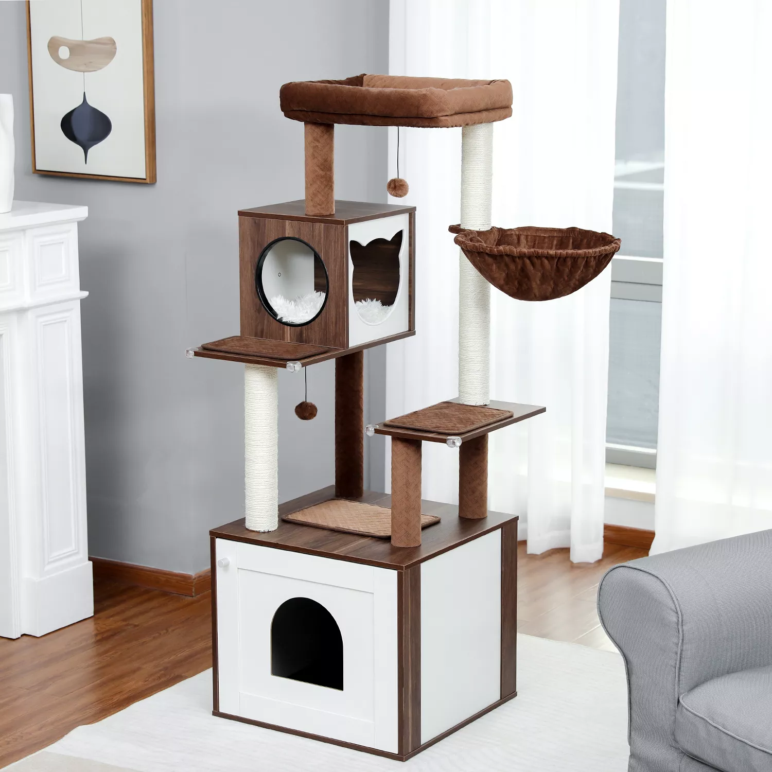 What sets this cat tree apart is the multifunctional cabinet at its base. This cabinet serves as a private bathroom for your cat, discreetly housing the litter box and providing your cat with the privacy they deserve. Alternatively, it can be used as a storage locker, ideal for keeping cat toys, food, or other essentials neatly out of sight. The solid construction and reinforced cabinet base ensure that this cat tree remains stable and secure, even during the most vigorous play sessions.