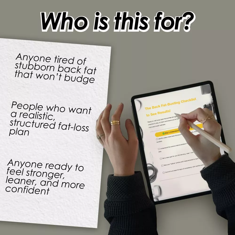 Struggling to get rid of stubborn back fat no matter how much you diet or exercise? You’re not alone — and you’re not out of options. The Back Fat-Busting Checklist to See Results! is your no-fluff, step-by-step digital guide designed to show you exactly how to lose back fat fast, without overwhelm or guesswork. Whether you’re dealing with upper back bulge, lower back fat, or love handles, this downloadable checklist makes your transformation clear, focused, and achievable. Ready to finally feel confident from every angle? This is your action plan.