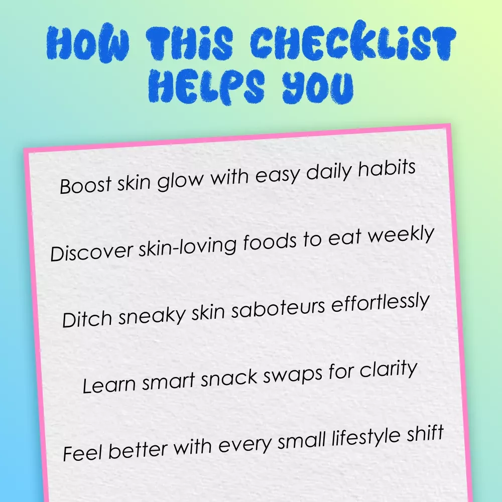 Unlike complex skincare routines or endless product trials, this checklist focuses on real, food-based solutions and easy lifestyle upgrades you can start now. It’s not just about what goes on your skin—it’s about what you put into your body and how you live each day. Designed with both simplicity and science in mind, this guide blends nutrition and mindfulness to support true skin health, not just temporary fixes.